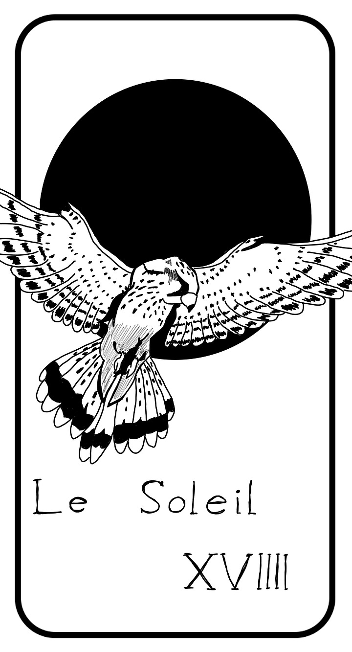 Il existe un set complet de ce premier jeu, et avant même l’avoir fini, j’ai commencé ma deuxième version. La frustration de ne pas avoir réussi quelque chose qui me plaise au premier coup m’incitait déjà à tâter d’autres terrains. Et comme je ne suis pas à l’aise avec la couleur, je me suis décidé pour une version noir et blanc en gardant la possibilité de mettre des cartes en couleur. Le soleil et la lune sont les premiers arcanes qui ont ont vu le jour.